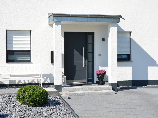 Wohin man auch schaut: Der Trend zu betont schlichten Haustürfüllungen ohne Lichtausschnitt, kombiniert mit Ganzglas-Seitenteilen, ist unverkennbar. Beliebt sind Modelle in Grautönen mit dezenten, eingefrästen Ziernuten, die optische Akzente setzen. Beispielhaft hierfür steht diese Eingangstür in Bad Oeynhausen mit dem geschlossenen Modell 6861-92. Vier waagerechte Profilierungen gliedern die glatte Fläche der flügelüberdeckenden Aufsatzfüllung und sorgen damit für eine klare Struktur und schöne Tiefenwirkung.